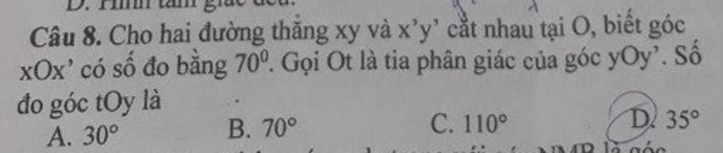 Câu 8. Cho hai đường thẳng xy và x’y’ cắt nhau tại O, biết góc xOx’ có số đo bằng 70. Gọi Ot là tia phân giác của góc yOy'. Số đo góc tOy là