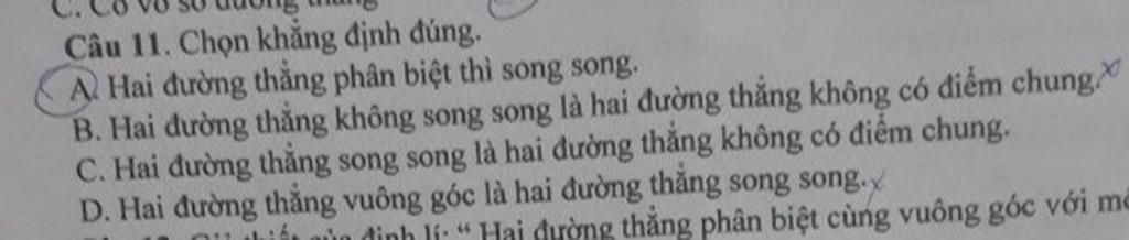 `@` Một đường thẳng cắt hai đường thẳng phân biệt và trong các góc tạo thành có một cặp góc so le trong thì hai đường thẳng song song,hai đường thẳng song song không có điểm chung