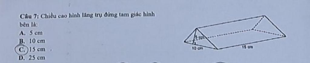 `->` Ta dựa vào hình, chiều cao hình lăng trụ đứng tam giác hình bên là `15cm`