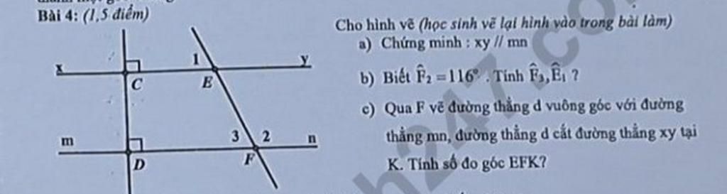 c). Qua F vẽ đường thẳng d vuông góc với đường thẳng mn, đường thẳng d cắt đường thẳng xy tại K. Tính số đo góc EFK?