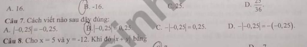 `B.|-0,25|=0,25->Đúng.`