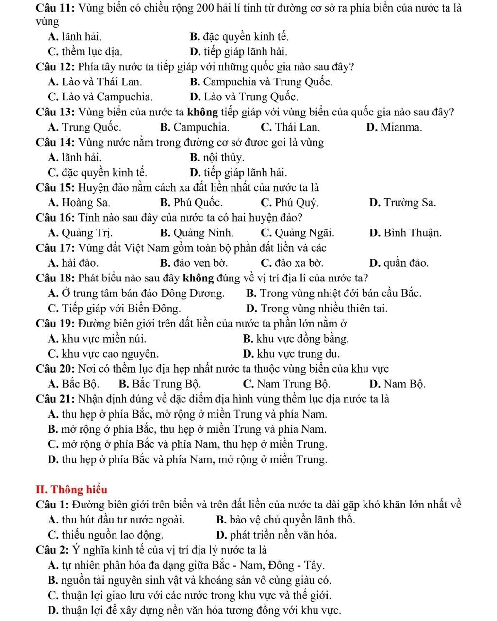 Câu 11: Vùng biển có chiều rộng 200 hải lí tính từ đường cơ sở ra phía biển của nước ta là