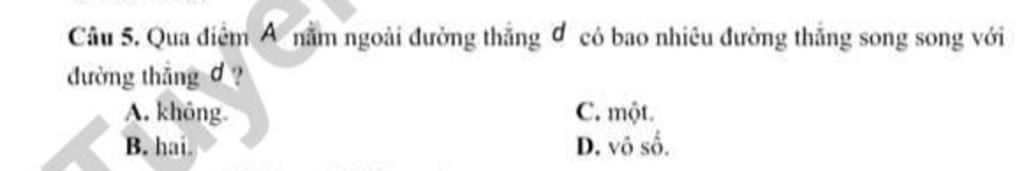 `@K``/n:` Qua điểm `A` nằm ngoài đường thẳng `d ` chỉ có một đường thẳng song song với đường thẳng `d`