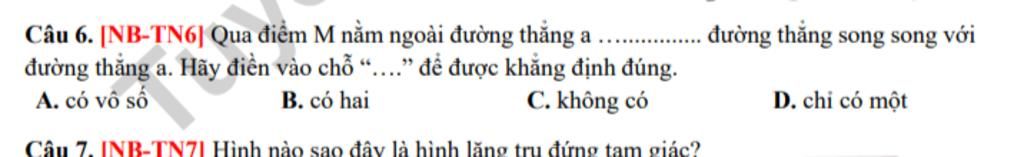 `=>` Từ cần điền: Qua điểm `M` nằm ngoài đường thẳng `a` chỉ có một đường thẳng song song với đường thẳng `a`.