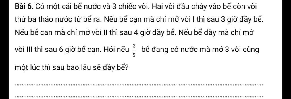nếu 3/5 bể đang có nước mà mở 3 vòi cùng 1 lúc thì đầy bể sau :