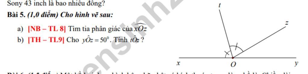 a) `\hat{tOx}` `=` `\hat{tOz}` `=>` `Ot` là tia phân giác của `\hat{xOz}`