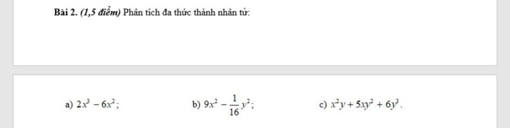 a, ta có:2x$^3$-6x$^2$=2x$^2$(x-3)$\\$b,9x$^2$-1/16y$^2$=(3x)$^2$-(1/4y)$^2$=(3x-1/4y)(3x+1/4y)$\\$c,x$^2$y+xy$^2$+6y$^3$=y(x$^2$+5xy+6y$^2$)=y(x$^2$+2xy+3xy+6y$^3$)=y[x(x+2y)+3y(x+2y]=y(x+2y)(x+3y)