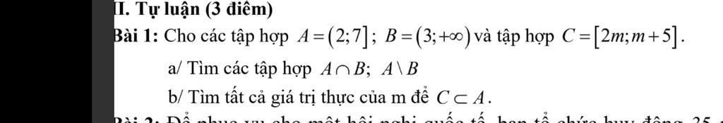 Bài 1: Cho các tập hợp A=(2;7]; B=(3;+oo) và tập hợp C=[2m;m+