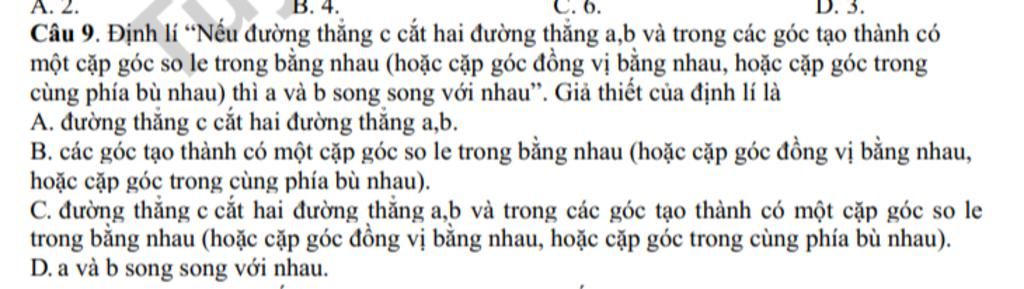 `@` Giả thiết là đường thẳng c cắt hai đường thẳng a,b và trong các góc tạo thành có một cặp góc so le trong bằng nhau (hoặc cặp góc đồng vị bằng nhau, hoặc cặp góc trong cùng phía bù nhau)
