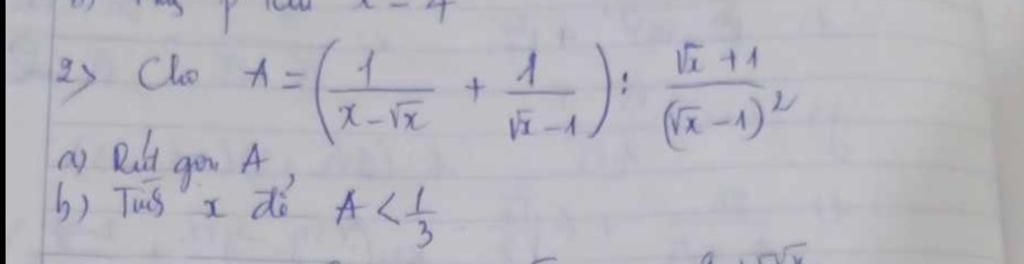 Ta có: `A= (1/(x - \sqrt{x}) + 1/(\sqrt{x} - 1)): (\sqrt{x} + 1)/((\sqrt{x} - 1)^2)`