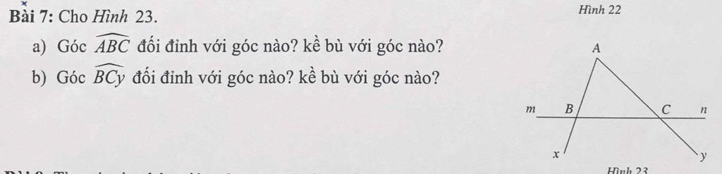 a) Góc $\widehat{ABC}$ đối đỉnh với $\widehat{mBx}$ , kề bù với $\widehat{CBx}$