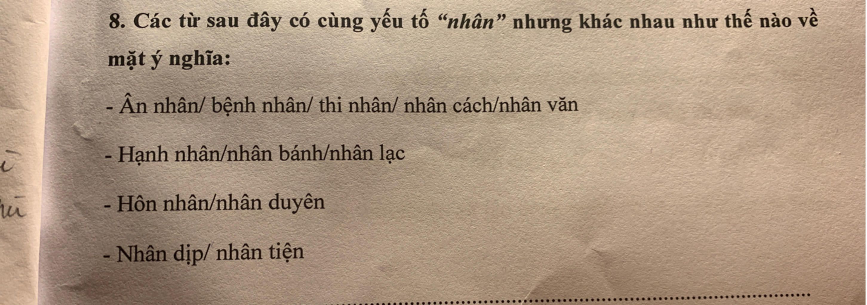 - Ân nhân / bệnh nhân / thi nhân / nhân cách/ nhân văn : đều là những từ chỉ người , tính cách , phẩm chất con người