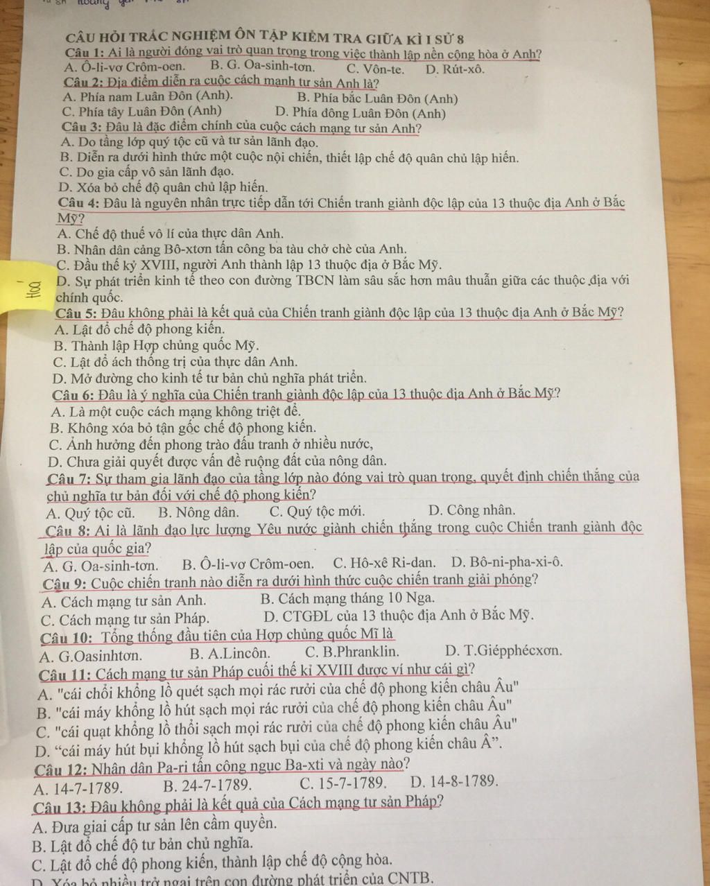 CÂU HỎI TRẮC NGHIỆM ÔN TẬP KIỂM TRA GIỮA KÌ I SỬ 8