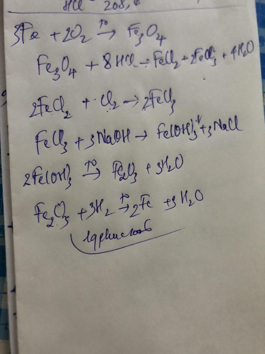 $\rm (1)\ 3Fe+2O_2\xrightarrow{t^°}Fe_3O_4\\(2)\ Fe_3O_4+8HCl\to FeCl_2+2FeCl_3+4H_2O\\(3)\ 2FeCl_2+Cl_2\to 2FeCl_3\\(4)\ FeCl_3+3NaOH\to Fe(OH)_3+3NaCl\\(5)\ 2Fe(OH)_3\xrightarrow{t^°}Fe_2O_3+3H_2O\\(6)\ Fe_2O_3+3H_2\xrightarrow{t^°}2Fe+3H_2O$