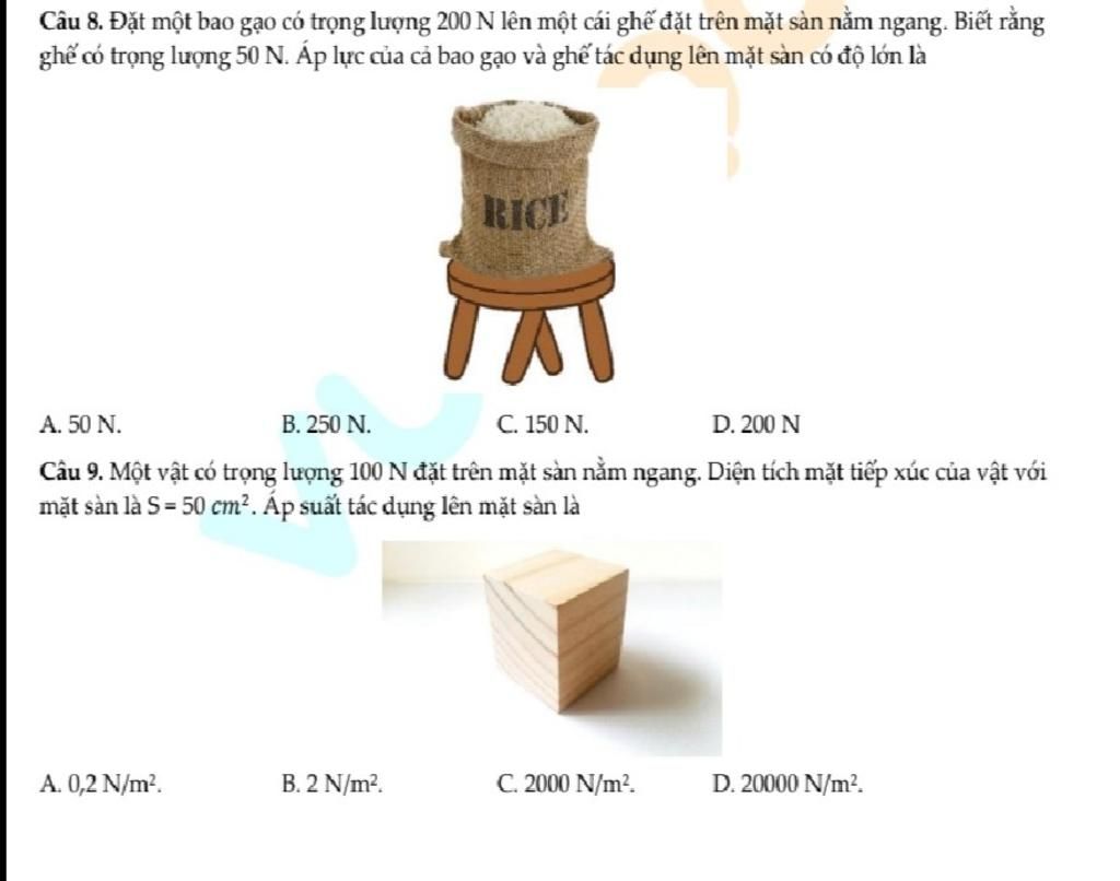 8. Áp lực cả bao gạo lẫn ghế tức là trọng lượng tổng cộng của bao gạo và ghế