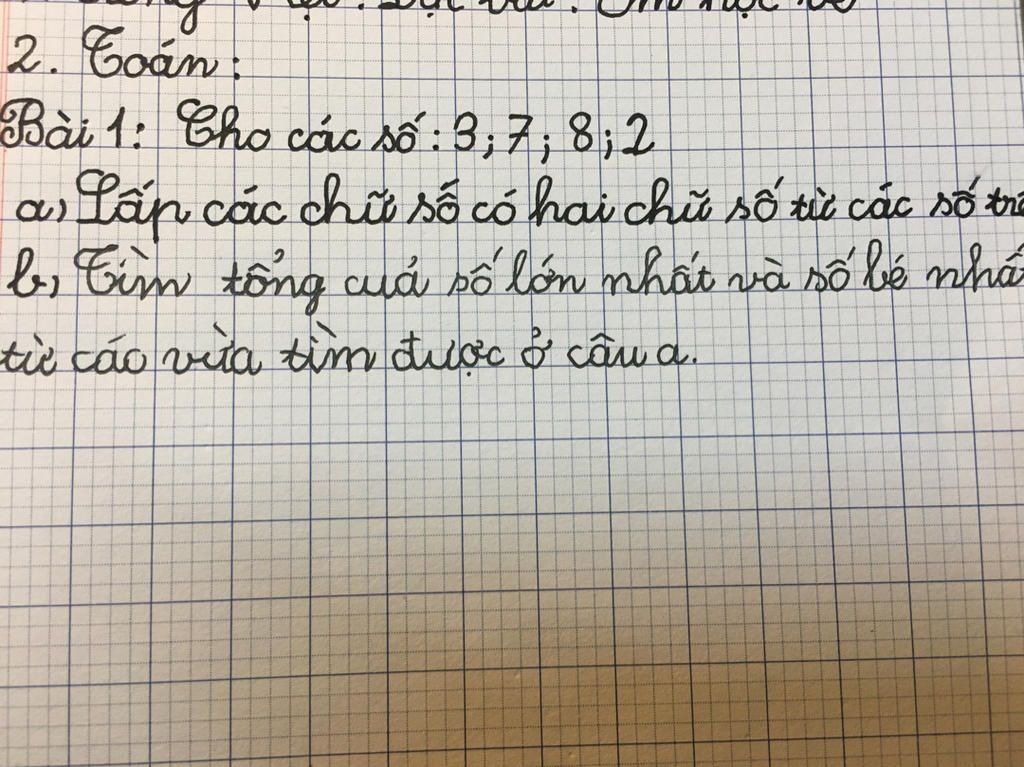 Các số có 2 chữ số từ các số3;7;8;2 là :23;27;28;32;37;38;72;73;78;82;83;87