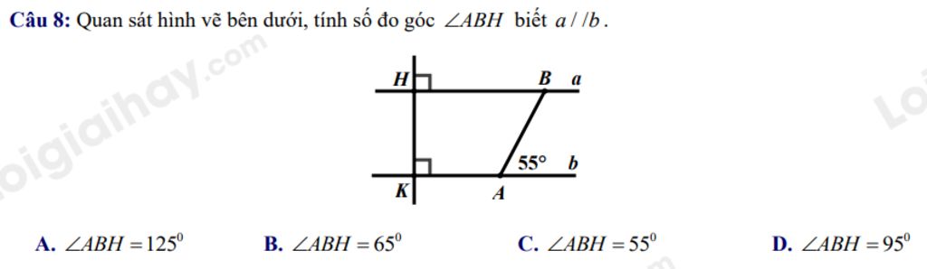 Ta có `:a` // `b(gt)` nên `hat{BAb}=hat{ABH}=55^o(` Hai góc so le trong `)`