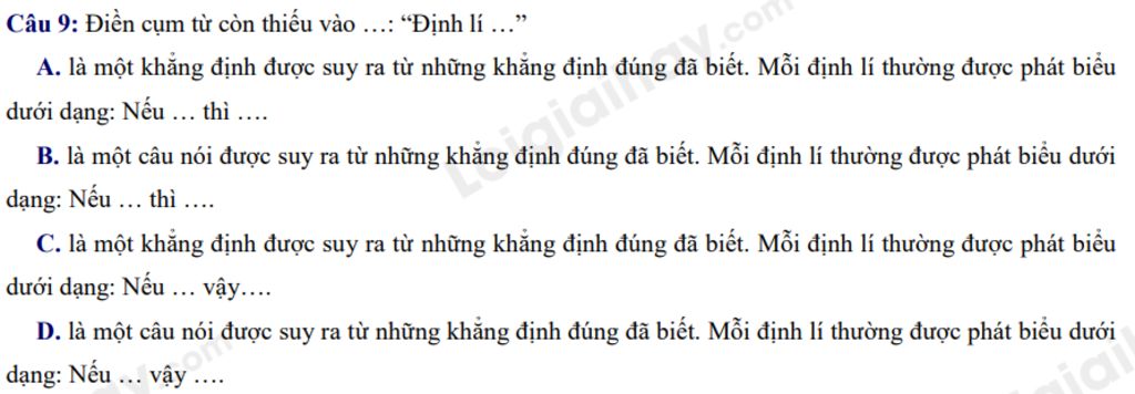 D. là một câu nói được suy ra từ những khẳng định đúng đã biết. Mỗi định lí thường được phát biểu dưới dạng: Nếu … vậy ….