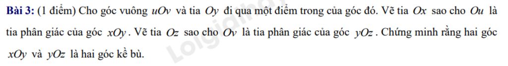 Bài 3: (1 điểm) Cho góc vuông uOv và tia Oy đi qua một điểm trong của góc đó. Vẽ tia Ox sao cho Ou là tia phân giác của góc xOy. Vẽ tia Oz sao cho Ov là tia phân giác của góc yOz. Chứng minh rằng hai góc xOy và yOz là hai góc kề bù.