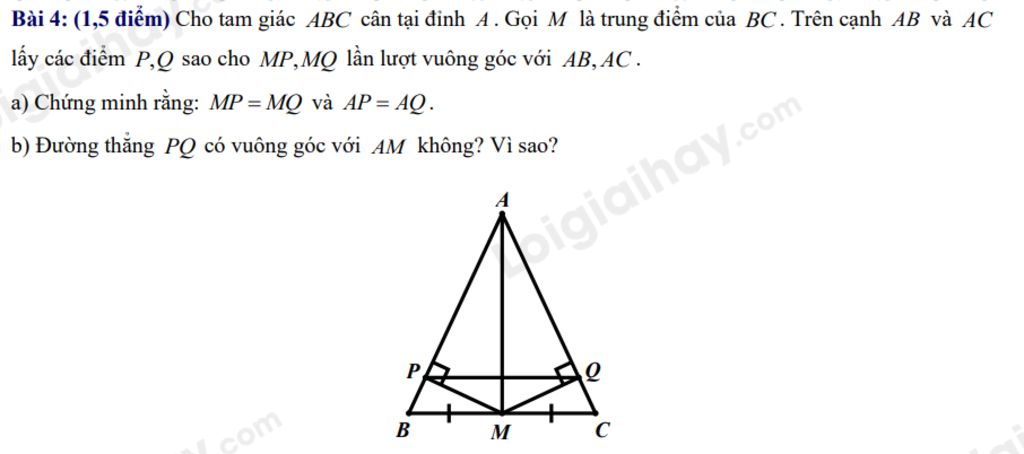 `b)`Theo câu `a` ta có, `AP = AQ` và `MP = MQ,` do đó `A` và `M` cùng cách đều hai điểm `P, Q` nên `AM` là đường trung trực của đoạn thẳng `PQ.`