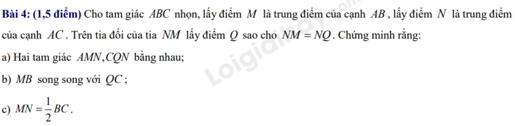Bài 4: (1,5 điểm) Cho tam giác ABC nhọn, lấy điểm M là trung điểm của cạnh AB , lấy điểm N là trung điểm