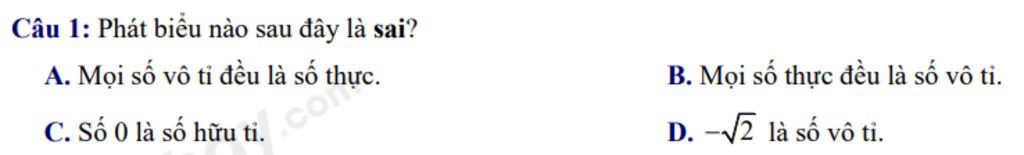 `+)` Đáp án `B` sai vì: Nếu ta giả sử ta cho tập hợp số vô tỉ `bbI` gồm các số có dạng các chữ số thập phân vô hạn không tuần hoàn mà cho số thực là một số hữu tỉ thì sẽ khác số vô tỉ vì nhỡ số hữu tỉ đó là số thập phân hữu hạn hoặc số thập phân vô hạn tuần hoàn thì nó sẽ không thuộc `bbI`
