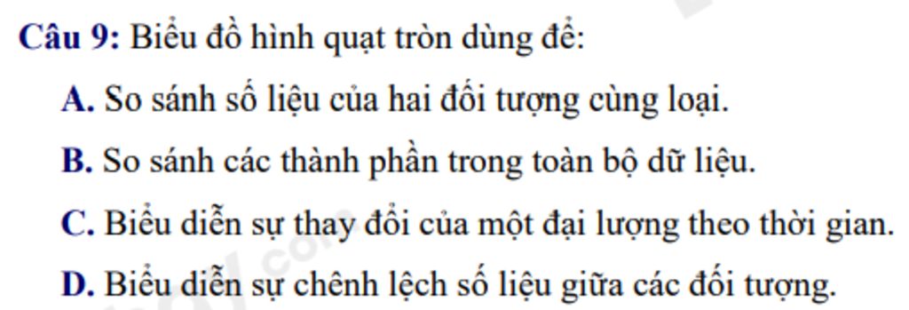 `->` Biểu đồ hình quạt tròn được dùng trong các bài toán so sánh các thành phần trong toàn bộ dữ liệu.