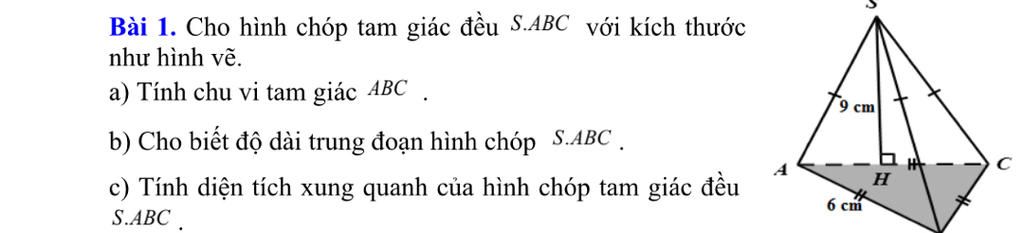 `b)` Trung đoạn hình chóp `S.ABC` có độ dài là `9cm`