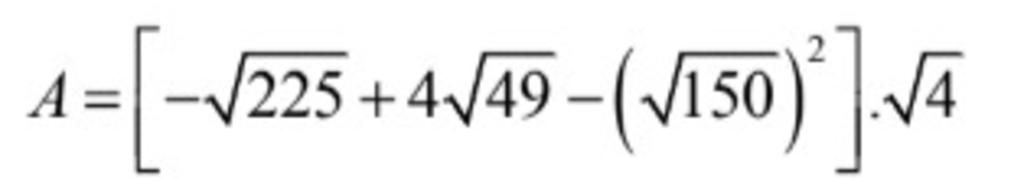 `A = [ -sqrt225 + 4sqrt49 - (sqrt150^2) ] . sqrt4`