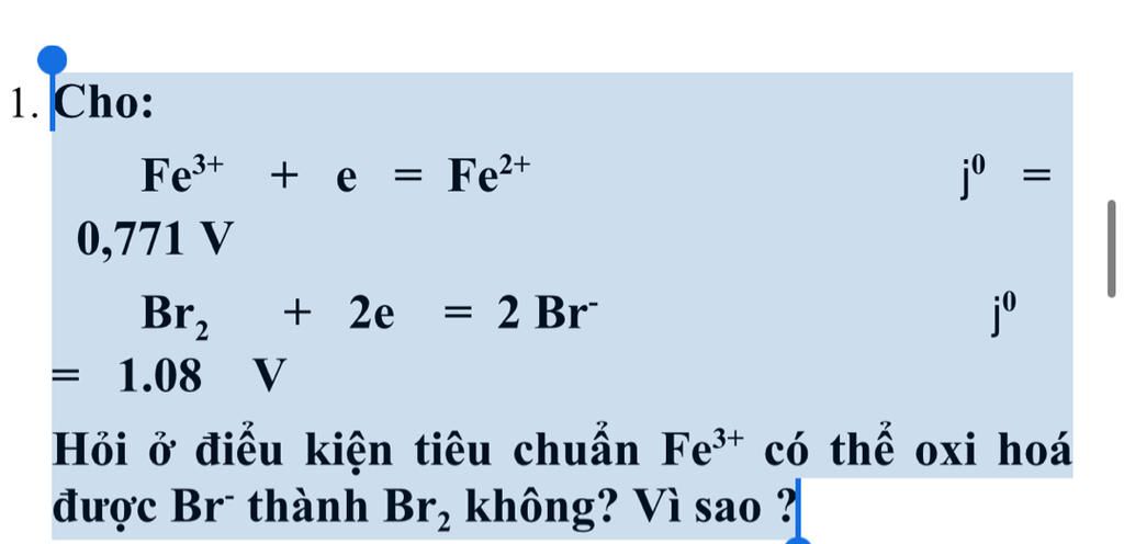 Vậy ở điều kiện tiêu chuẩn, phản ứng xảy ra là $2Fe^{2+}+Br_2\to 2Fe^{3+}+2Br^-$, do đó $Fe^{3+}$ không oxi hoá được $Br^-$ thành $Br_2$