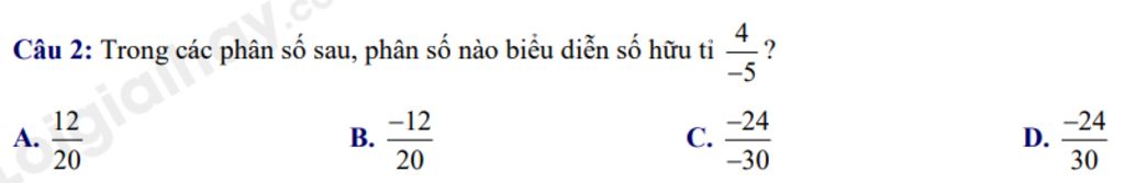 $\bullet$ Phân số biểu diễn `4/-5` phải là phân số âm `=>` Ta loại `A` và `C`