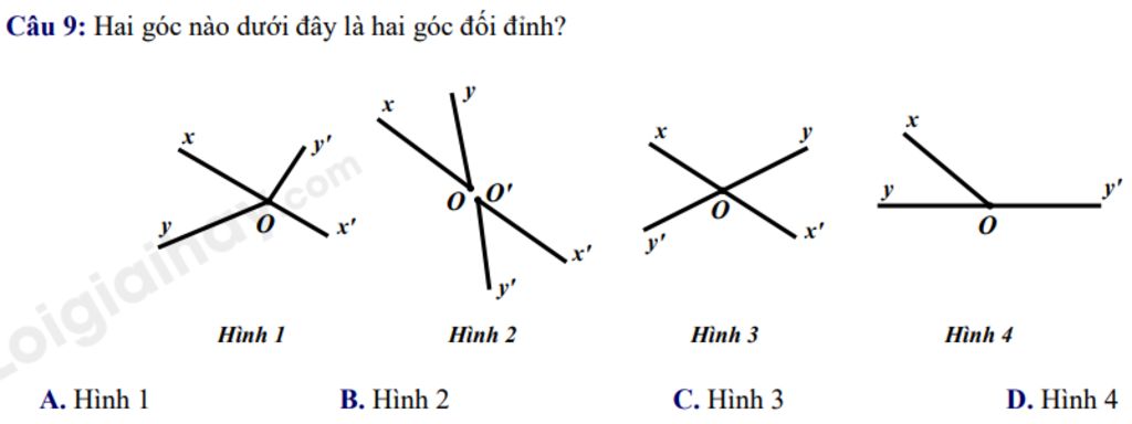 `@` Khái niệm `:` Hai góc đối đỉnh là hai góc mà mỗi cạnh của góc này là tia đối của một cạnh của góc kia.