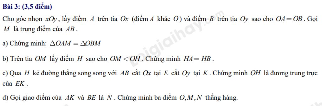 Bài 3: (3,5 điểm) Cho góc nhọn xOy, lấy điểm A trên tia Ox (điểm A khác O) và điểm B trên tia Oy sao cho OA = OB. Gọi M là trung điểm của AB.
