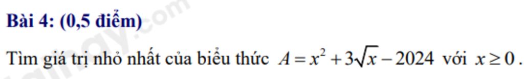 Vậy, giá trị nhỏ nhất của `A = x^2 + 3sqrt{x} - 2024` là `-2024` khi `x = 0`