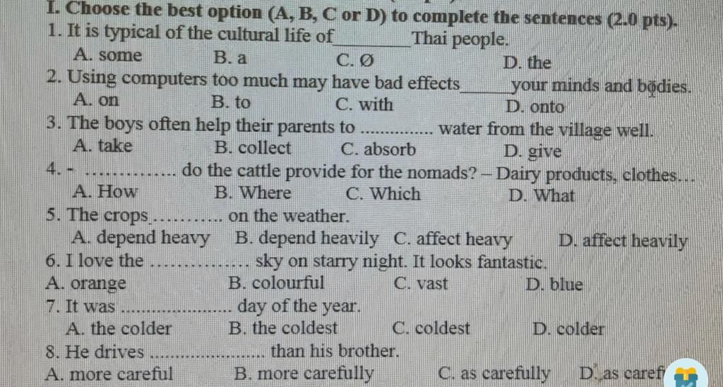 I. Choose the best option (A, B, C or D) to complete the sentences (2.0 pts).