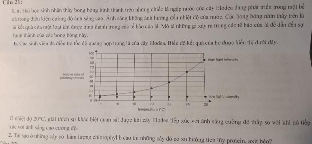 1. a. Hai học sinh nhận thấy bong bóng hình thành trên những chiếc lá ngập nước của cây Elodea đang phát triển trong một bể