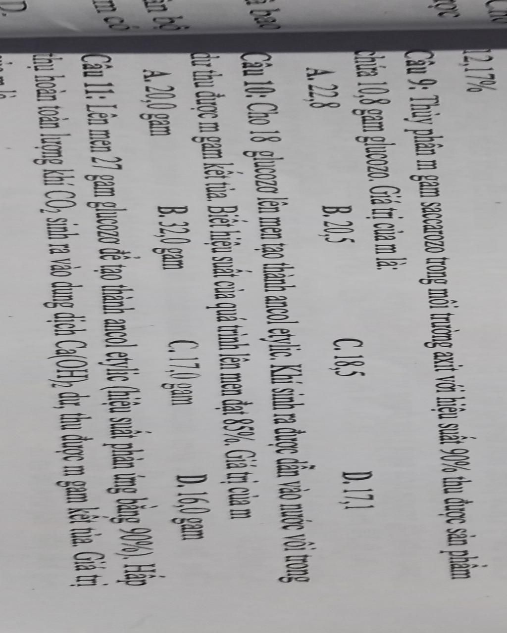 Câu 10: Cho 18 glucozo lên men tạo thành ancol etyli. Khi sinh ra được dẫn vào nước vôi trong