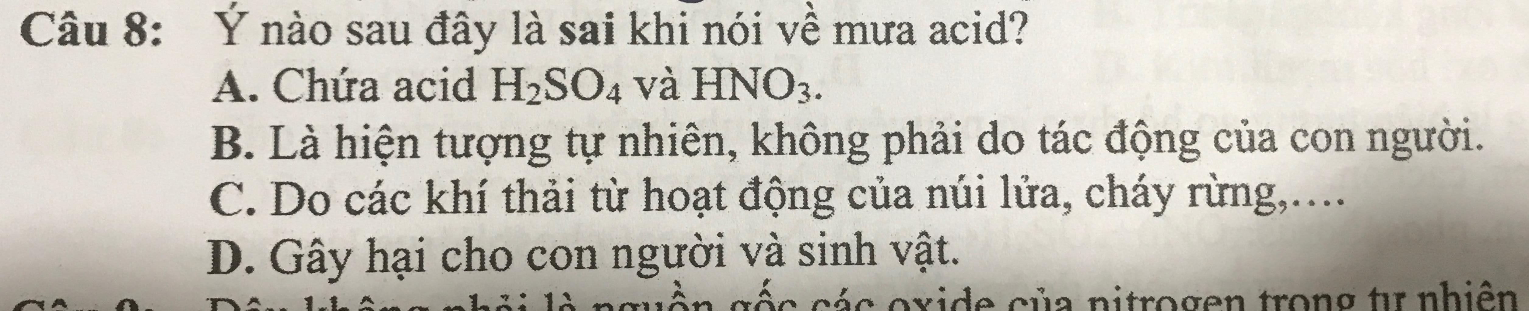 $-B$ sai vì hàm lượng $SO_2$ và $NO_x$ trong tự nhiên rất ít, coi như không đáng kể nên rất khó có thể tạo ra mưa acid. Dưới sự tác dộng của con người trong các hoạt động khác nhau khiến hàm lượng $SO_2$ và $NO_x$ tăng đáng kể, từ đó tạo ra mưa acid.