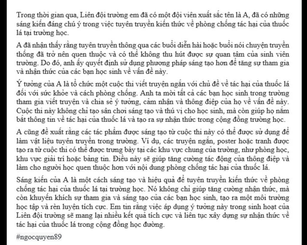 Trong thời gian qua, Liên đội trường em đã có một đội viên xuất sắc tên là A, đã có những sáng kiến đáng chú ý trong việc tuyên truyền kiến thức về phòng chống tác hại của thuốc lá tại trường học.