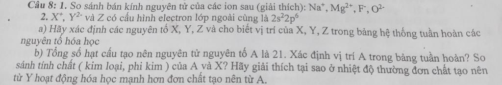 => Bán kính nguyên tử xếp theo giảm dần: `O^{2-}>F^{-}>Na^{+}>Mg^{2+}`