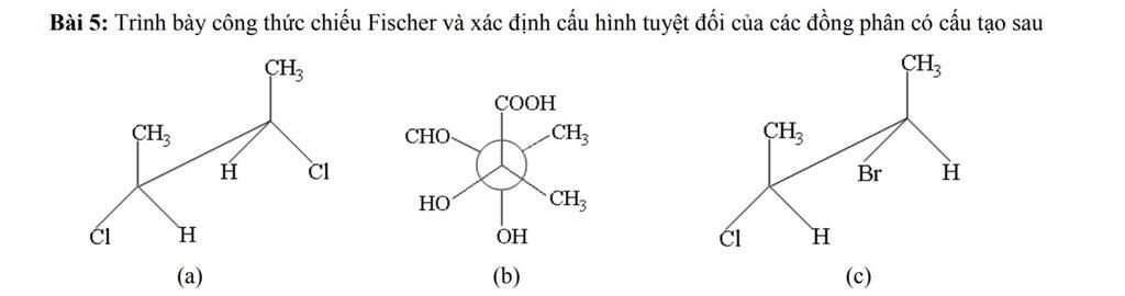 Lưu ý khi viết công thức Fischer: Trục thẳng đứng là mạch carbon chính, số chỉ $C^*$ nhỏ dần từ trên xuống dưới. Với hợp chất (c), tên hợp chất là 2-bromo-3-chlorobutane do theo danh pháp IUPAC, bromo và chloro cùng là nhóm thế, không phân biệt vị trí nên phân biệt dựa vào bảng chữ cái, vì $b<c$ nên bromo có số chỉ nhỏ hơn.