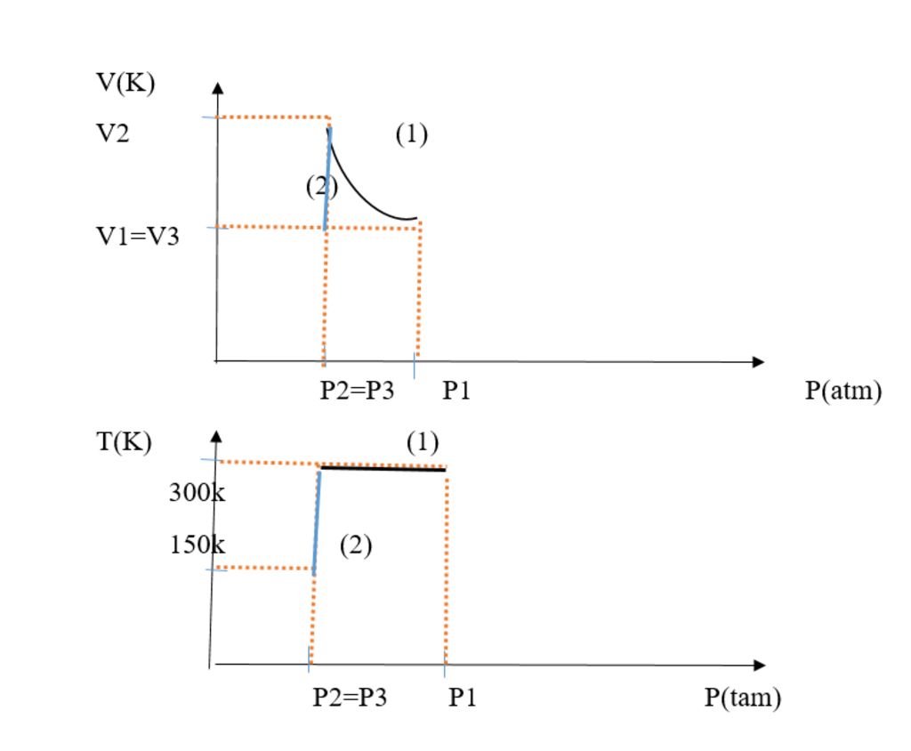 \(\dfrac{{{V_2}}}{{{T_2}}} = \dfrac{{{V_3}}}{{{T_3}}} \Rightarrow {T_3} = {T_2}.\dfrac{{{V_3}}}{{{V_2}}} = {T_1}\dfrac{{{V_1}}}{{2{V_1}}} = \dfrac{{300}}{2} = 150K\)