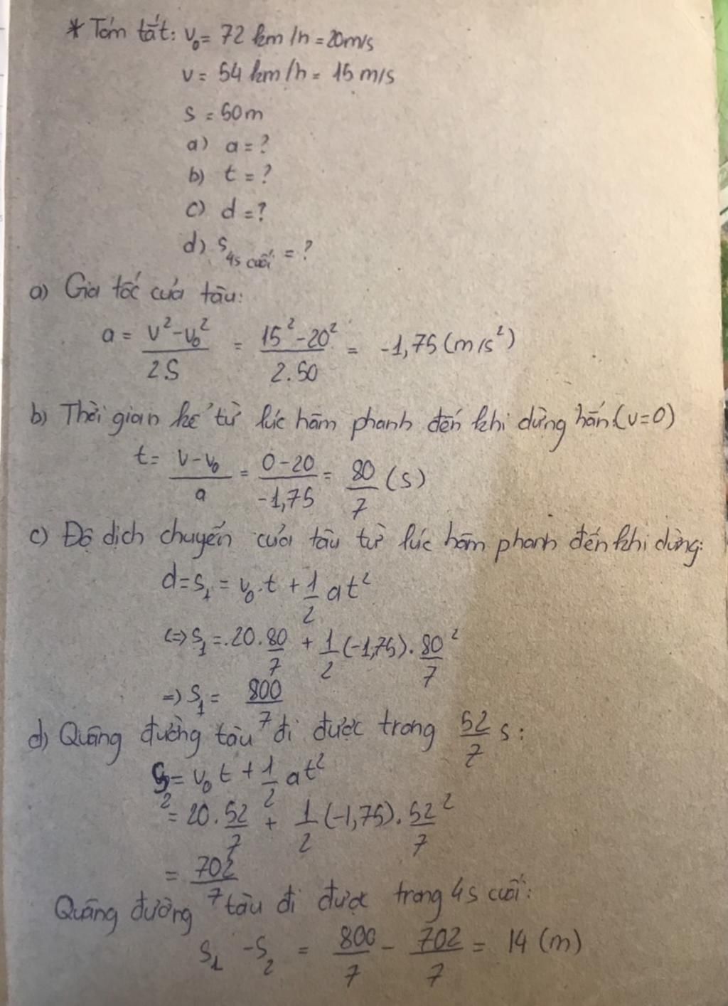 \({s_2} = {v_0}{t_2} + \dfrac{1}{2}at_2^2 = 20.\dfrac{{52}}{7} - \dfrac{1}{2}.1,75.{\left( {\dfrac{{52}}{7}} \right)^2} = \dfrac{{702}}{7}\left( m \right)\)