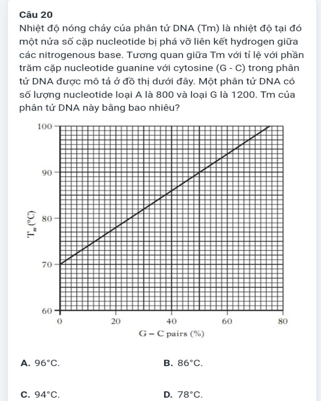 `+` Quan sát đồ thị: `%(G-C) = 60% →` tương ứng `T_M (.^oC)=94^oC.`