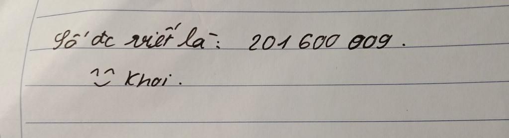 Vậy số gồm `2` trăm triệu `,1` triệu `,6` trăm nghìn và `9` đơn vị được viết là `:201600009`