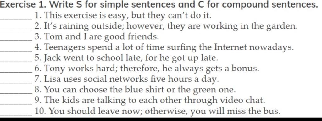 Compound Sentences: hiểu như câu ghép của tiếng Việt, có nhiều hơn 2 cặp chủ ngữ và vị ngữ, bên cạnh đó có các từ nối. Ví dụ như ở c1 là but(nhưng), c2 là however(tuy nhiên), c5 là for(bởi vì), c6 là therefore(vì vậy), c10 là otherwise(nếu không)