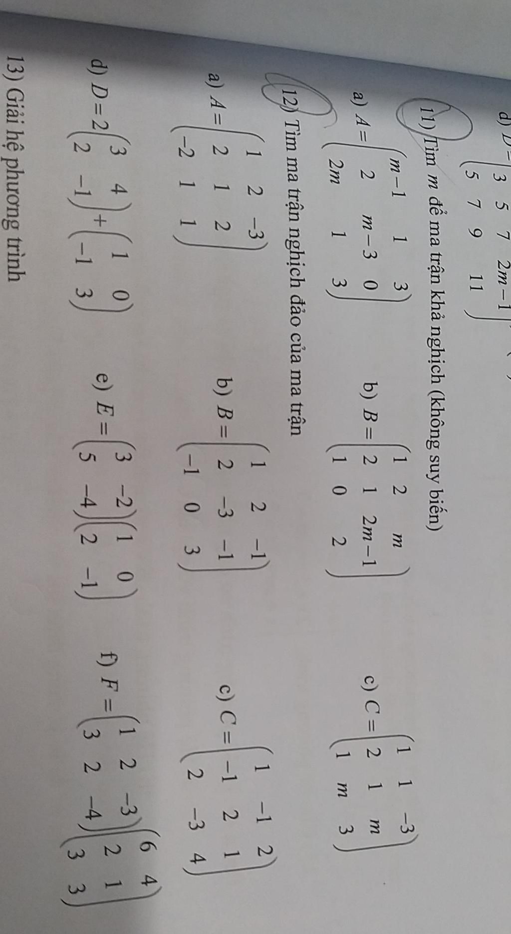 11) Tìm m để ma trận khả nghịch (không suy biến)