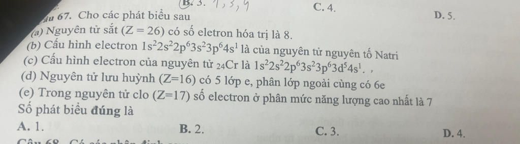 (e) sai, \(Cl:1s^22s^22p^63s^23p^5\) có số e phân mức năng lượng cao nhất là `5(3p^5)`