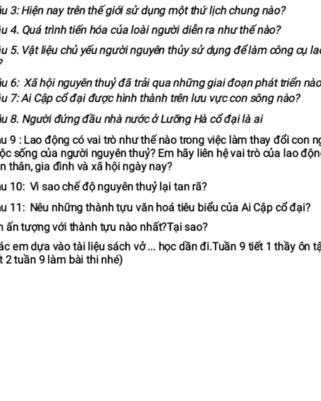 Câu `5:`Vật liệu chủ yếu người nguyên thủy sử dụng để làm công cụ lao động là `đá`
