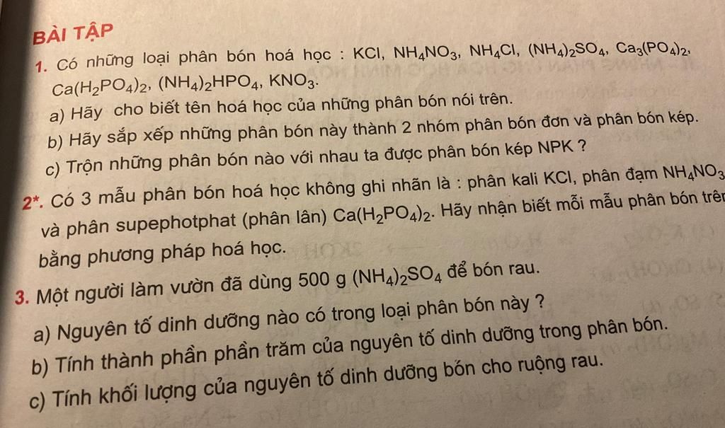 1. Có những loại phân bón hoá học : KCI, NH4NO3, NHẠCI, (NH4)2SO4, Ca3(PO4)2,